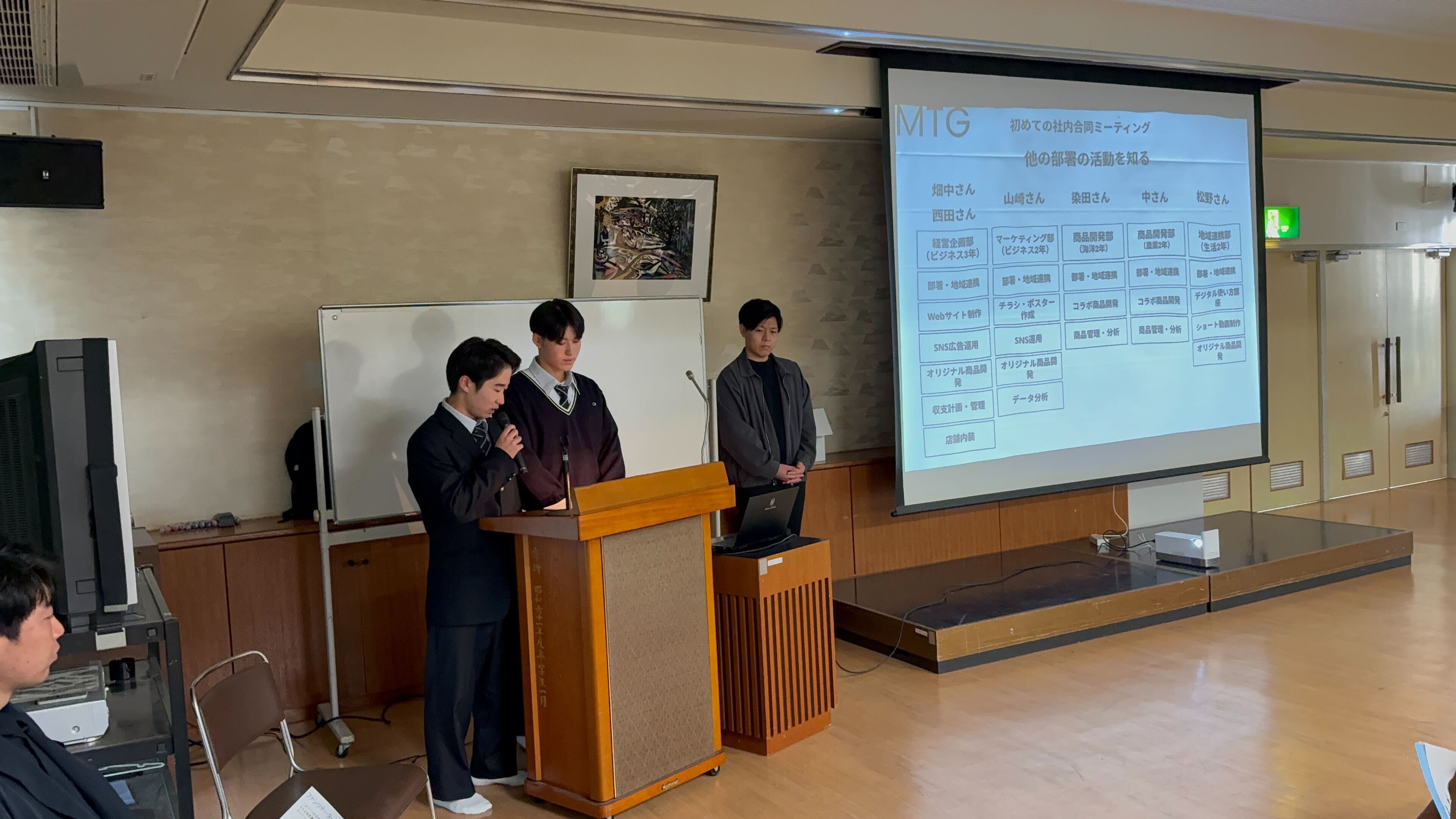 生徒たちが主体となって、話し合いや実践に取り組んでいる様子です。 教室での座学だけでなく、実際の商品開発や店舗運営について真剣に議論を重ねています。